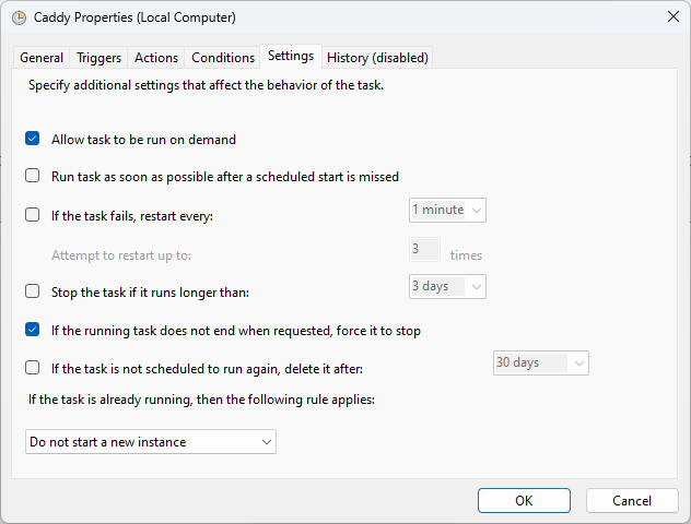 16. Go to the Settings Pane in the dialog and uncheck the Stop the task if it runs longer than checkbox, then click OK